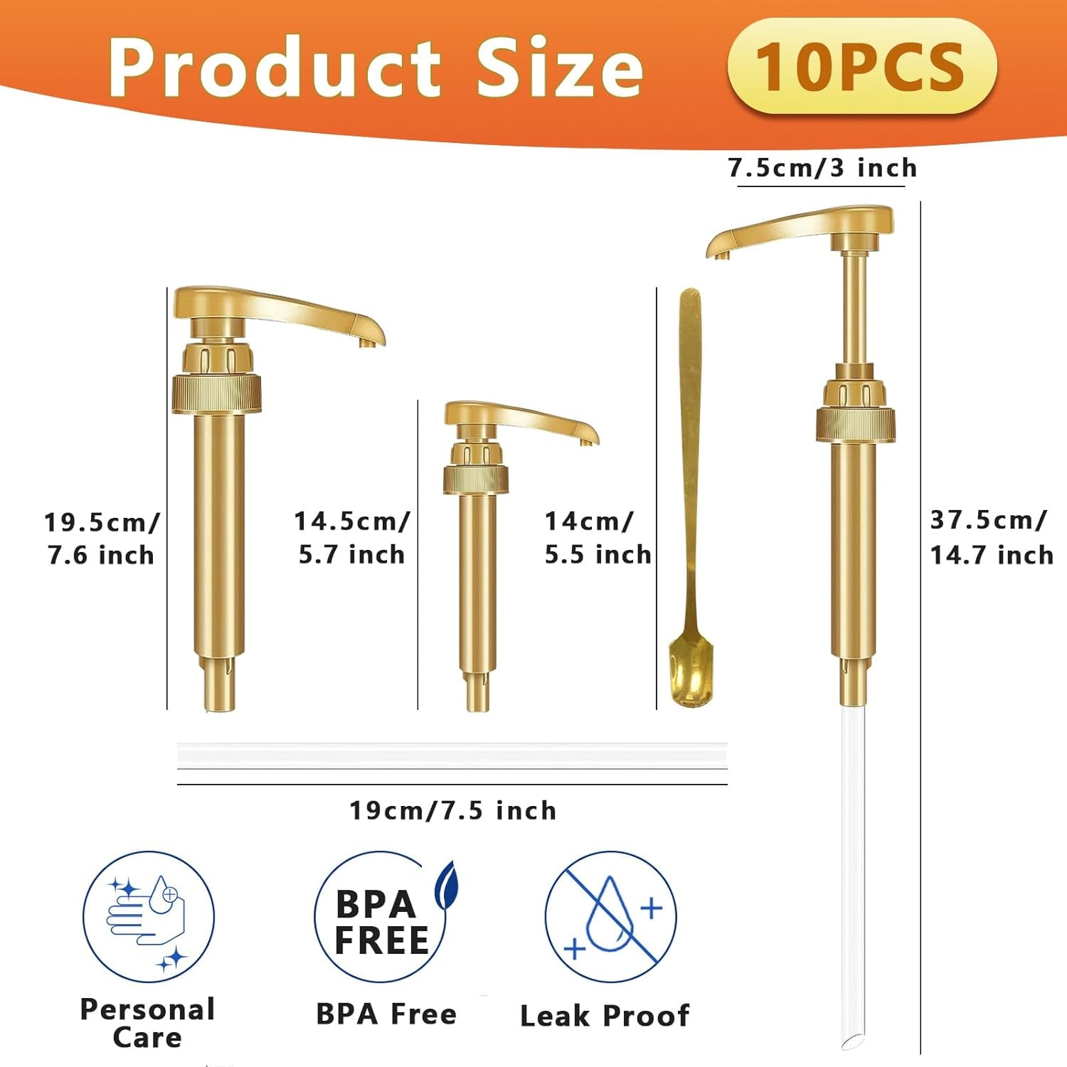 Stock your coffee station with this 10-pack of durable pump dispensers engineered for 25.4 oz syrup bottles. Built from sturdy, recyclable plastic, these pumps feature a 7.5" dip tube that reaches every last drop at the bottom of your bottle—no waste, no mess. The twist-lock mechanism prevents dripping while allowing precise portion control with each press. Whether you're flavoring lattes, cappuccinos, or specialty drinks at home or in a busy café, these reliable dispensers deliver consistent results day after day. Includes four golden spoons for easy mixing. Backed by a 12-month guarantee and responsive customer support.