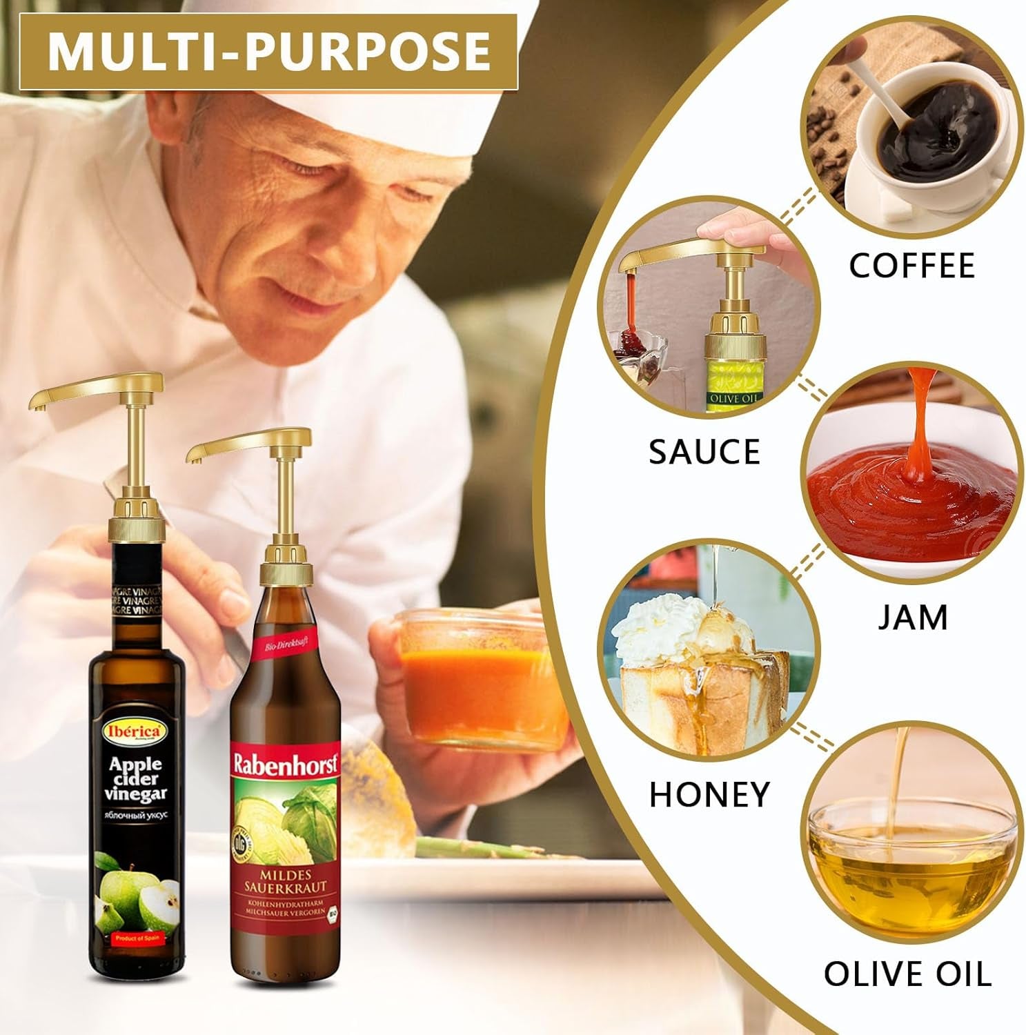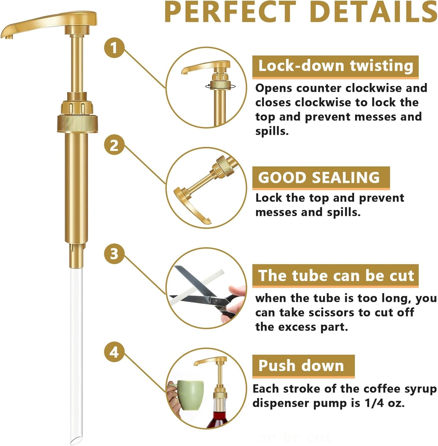 Keep your coffee syrups organized and mess-free with this 10-pack of pump dispensers designed to fit standard 25.4 oz bottles. The no-drip design prevents sticky countertops and wasted product, making flavor additions quick and precise for home baristas and coffee bars alike. Each dispenser delivers consistent portions, so you'll nail your flavor ratios every time. The bundle includes four golden spoons for easy stirring and serving. Upgrade your coffee station with a practical solution that saves time, reduces waste, and keeps your workspace clean.