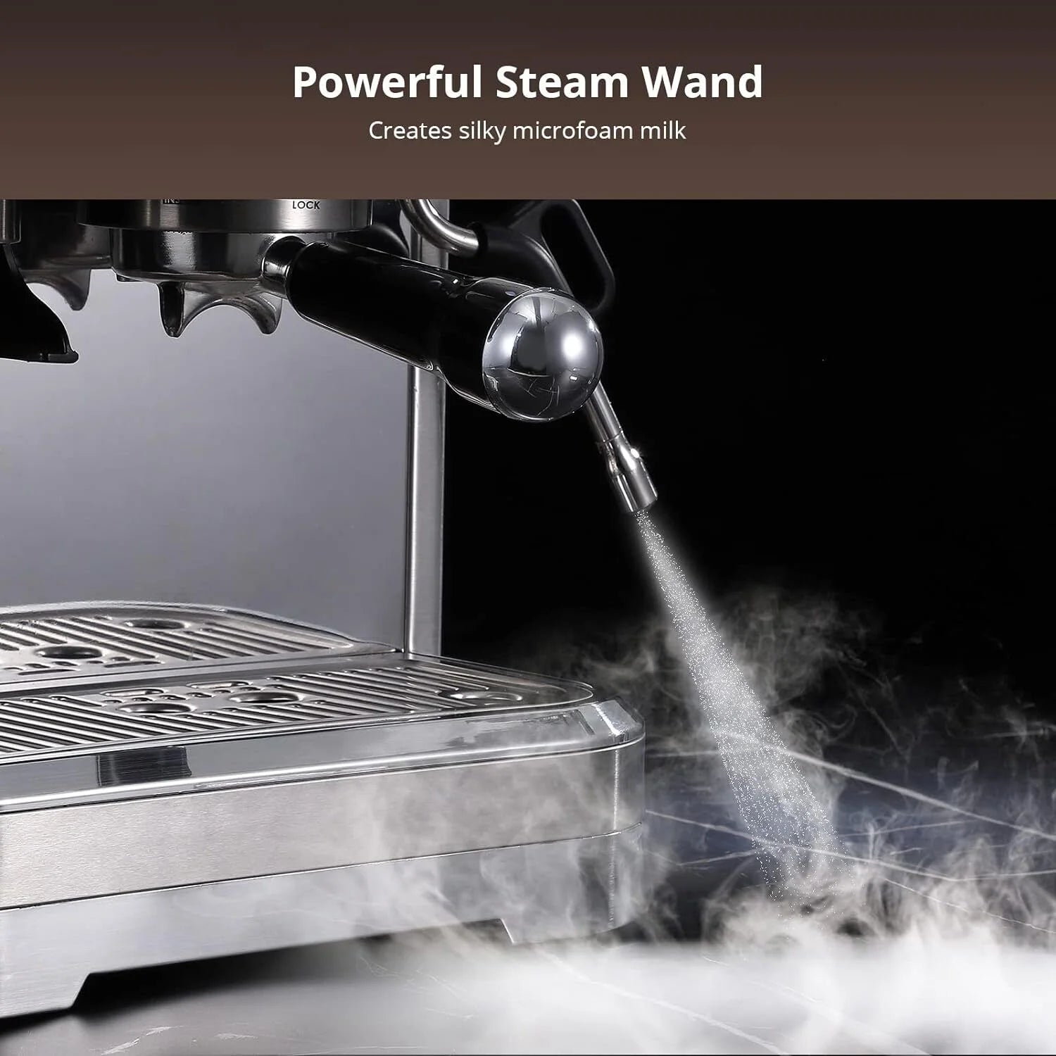 - Powerful Milk Foaming: Professional frothing milk for cappuccinos and lattes can be achieved using a hot steam wand and ceramic burr grinders. It's easy to adjust the stainless steel steam wand by rotating the side button, which releases hot steam or hot water, creating silky and smooth foam for milk to make cappuccino and latte drinks just like those served in a coffee shop.