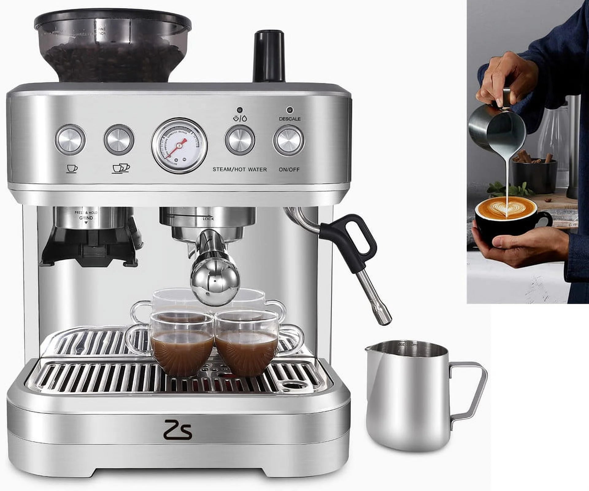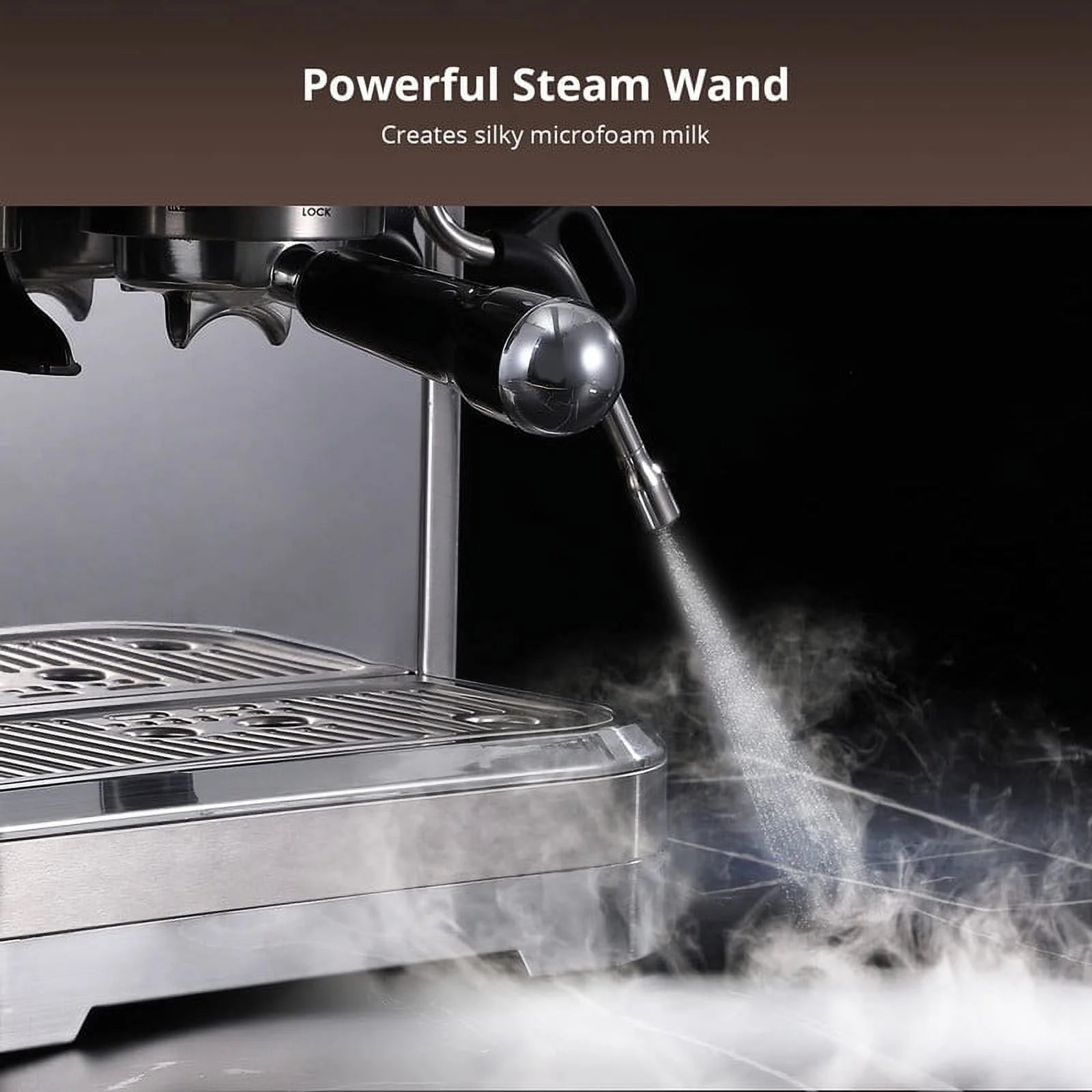 Powerful Steam Wand: The powerful steam wand creates silky microfoams to enrich coffee flavor. This coffee maker with grinder and steamer helps you make cafe-quality classics without traveling to coffee house