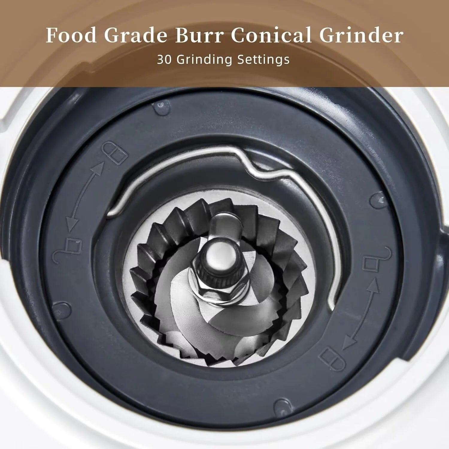 - Integrated precision conical burr grinder with 30 grind settings for customized coffee grinding