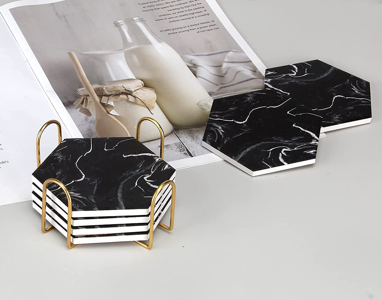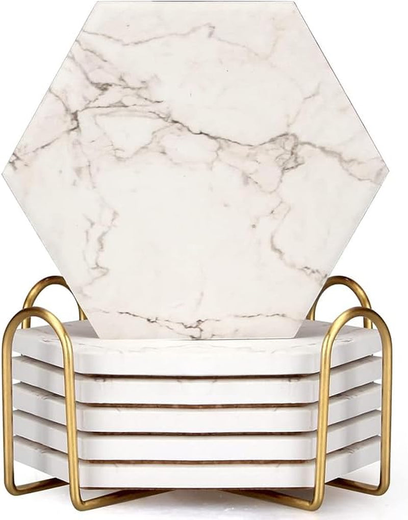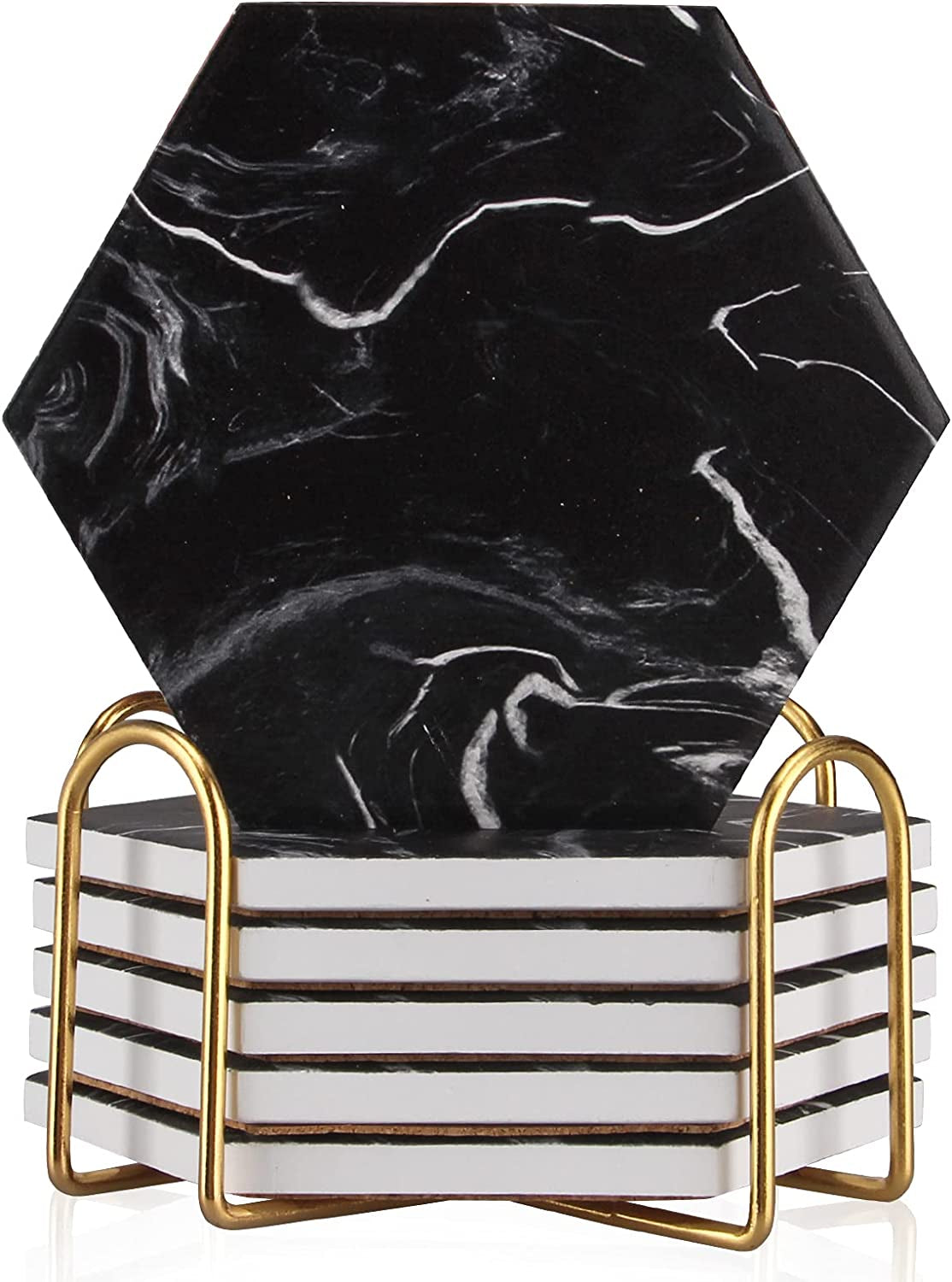 Hexagon Absorbent Coasters Modern Ceramic Coaster Set Coaster with Metal Holder Set: Includes 6 pcs 4 inch black marble coasters... Read more