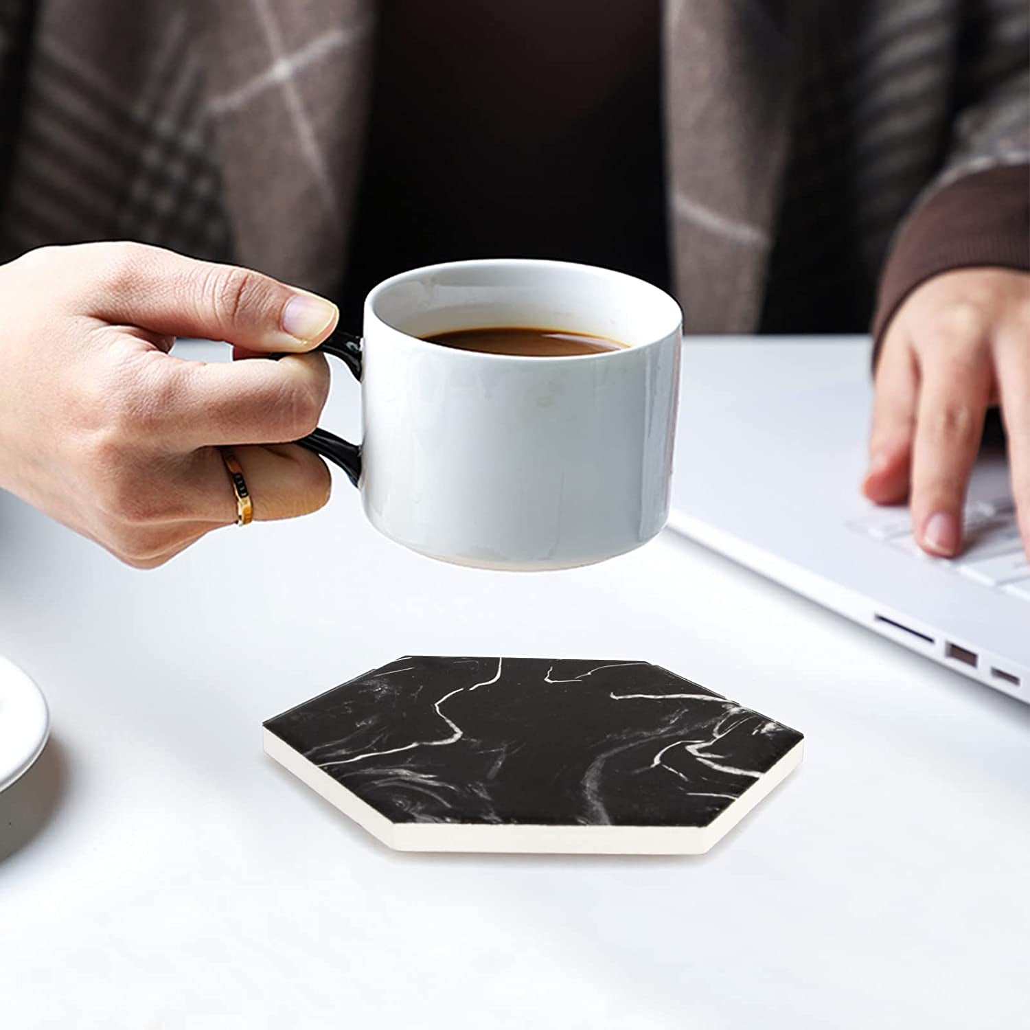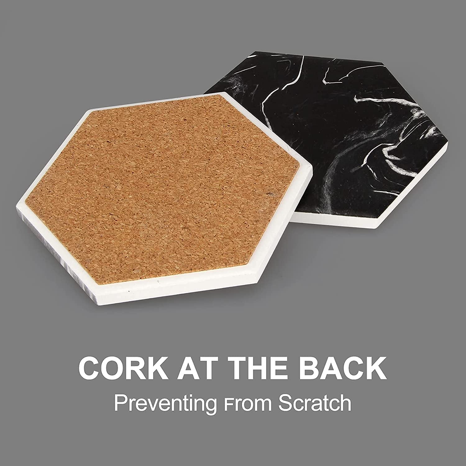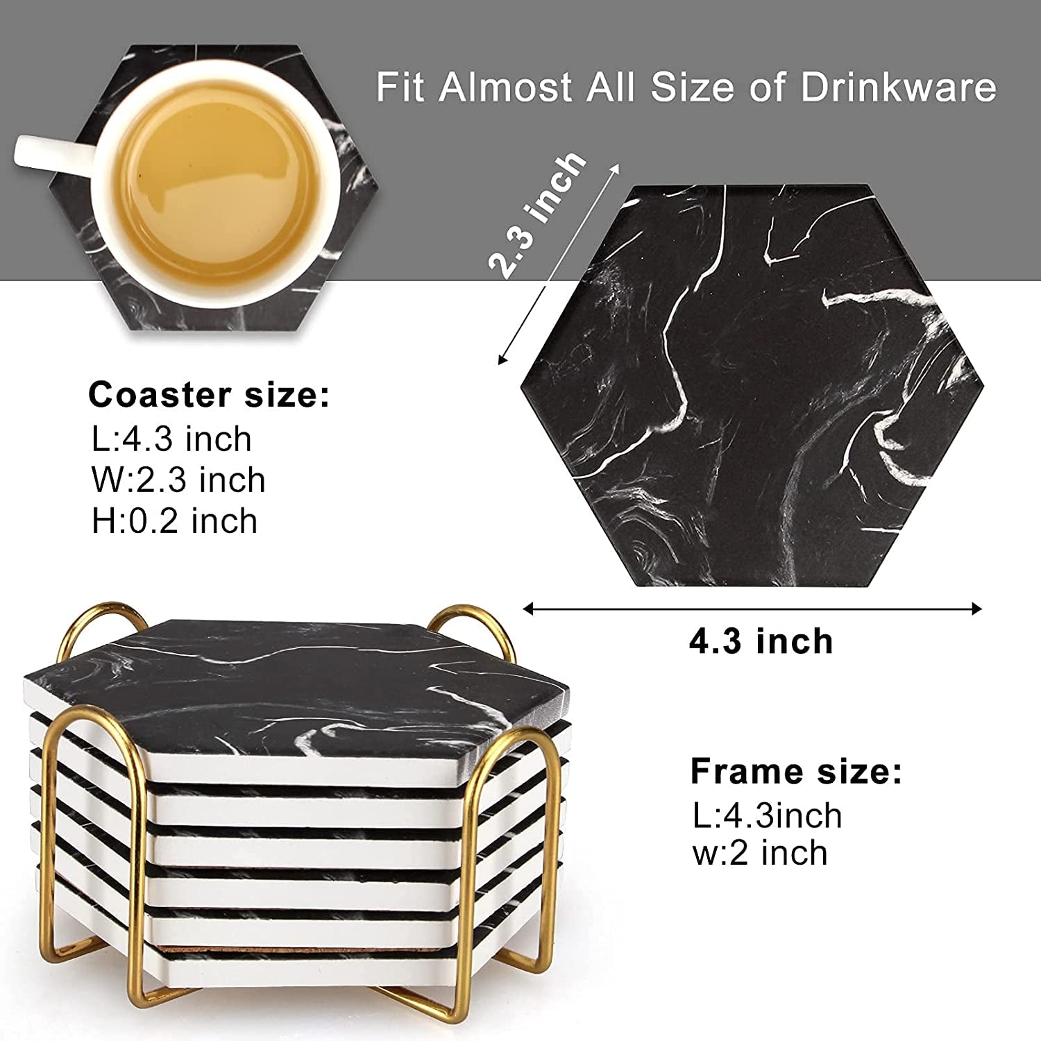 Hexagon Absorbent Coasters Modern Ceramic Coaster Set Coaster with Metal Holder Set: Includes 6 pcs 4 inch black marble coasters... Read more