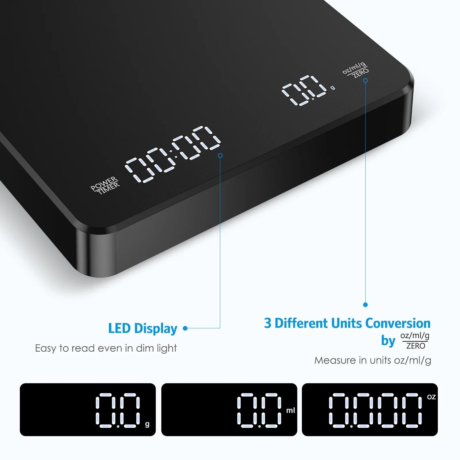 - Support 3 different units g/oz/ml switching, can weigh solid, liquid, powder, and can also be used in various scenarios such as espresso brewing, cooking, baking, milk powder and meal preparation, etc.