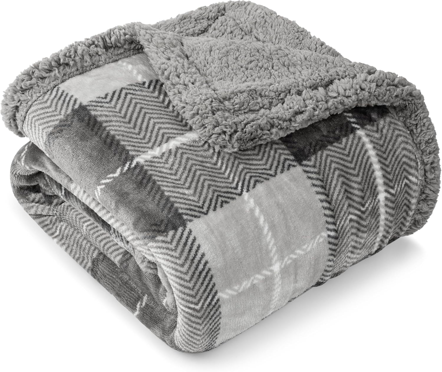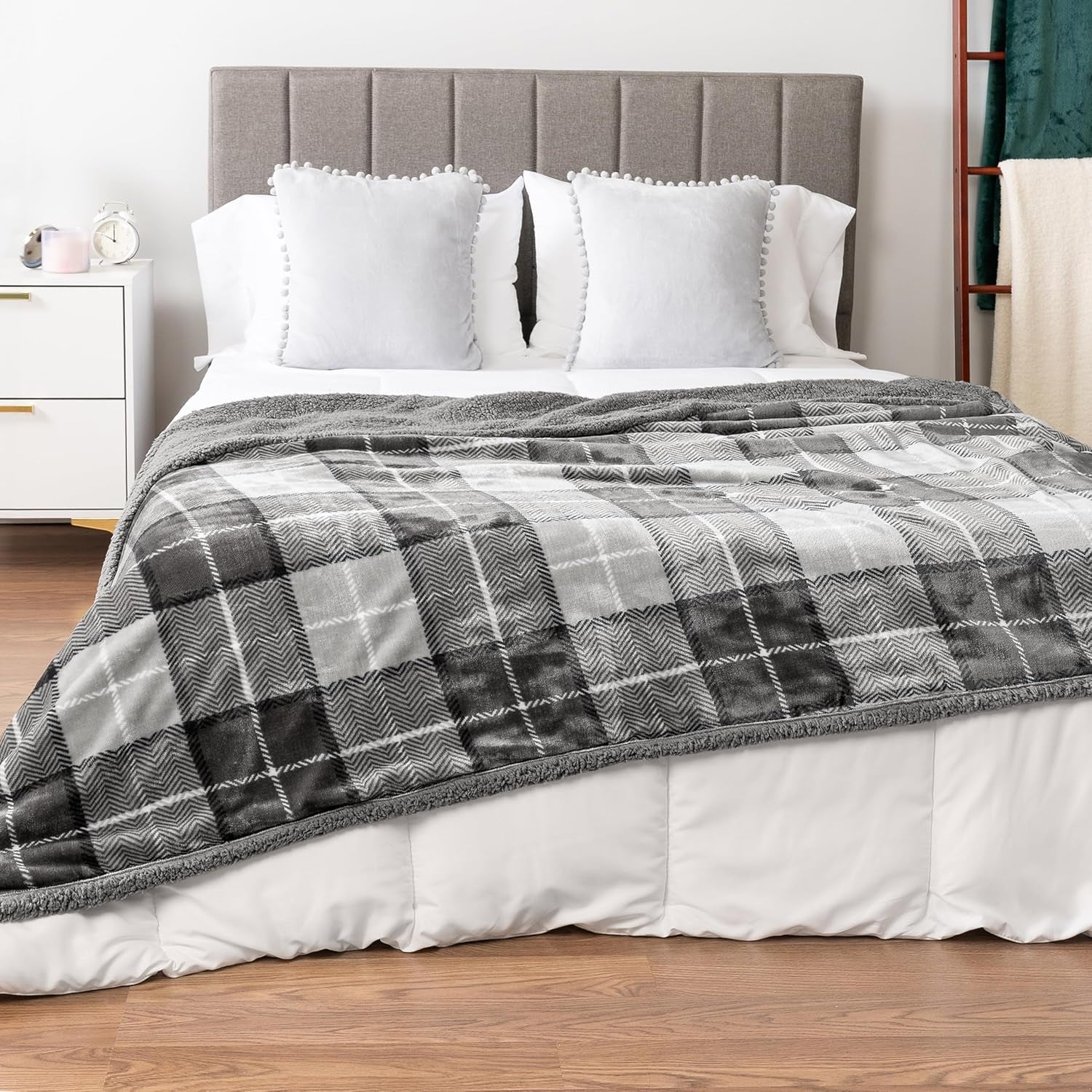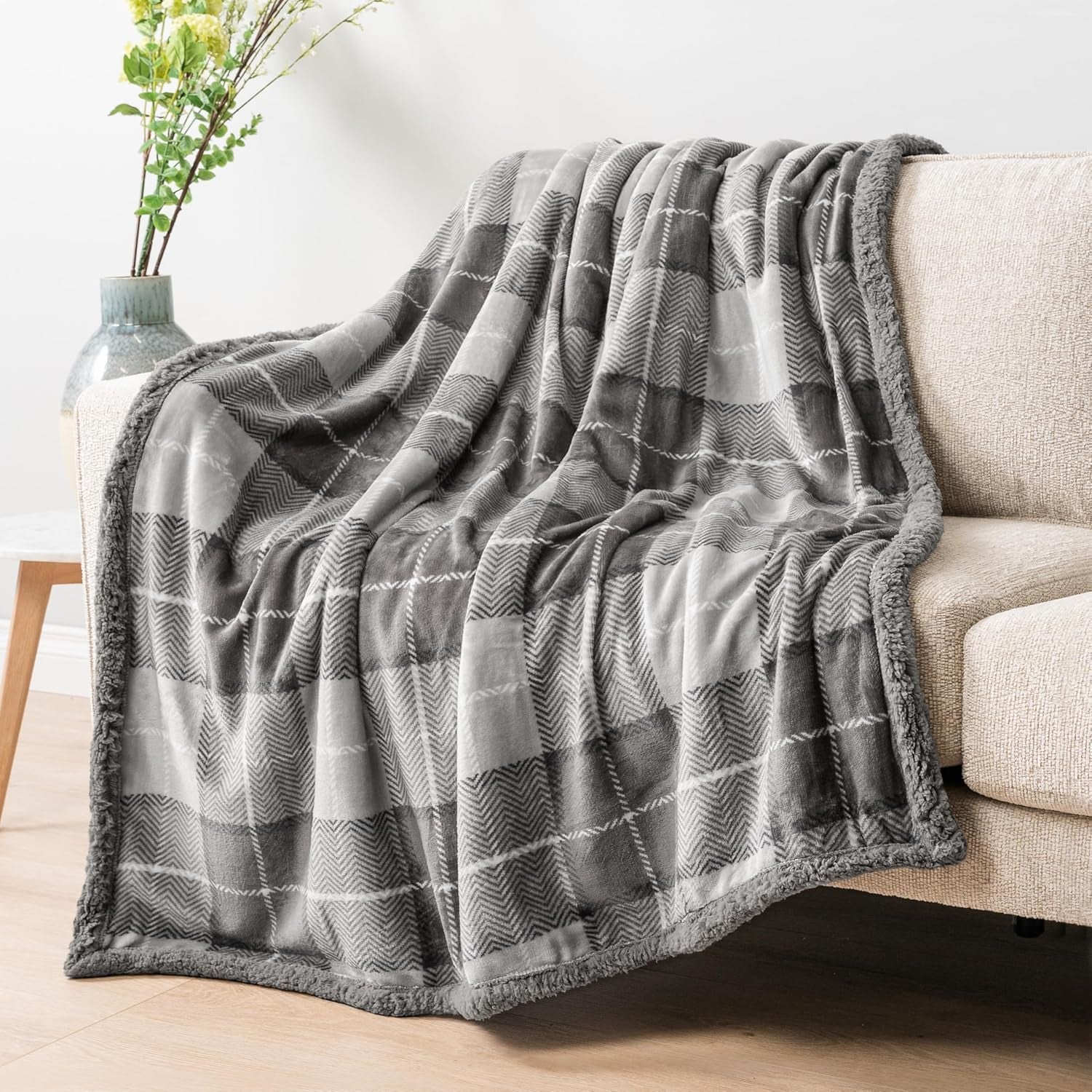 Cuddle Up in Style: The Snuggle-icious Light Grey Plaid Sherpa Blanket – Perfect for Couch Potatoes and Twin Bed Dreamers!