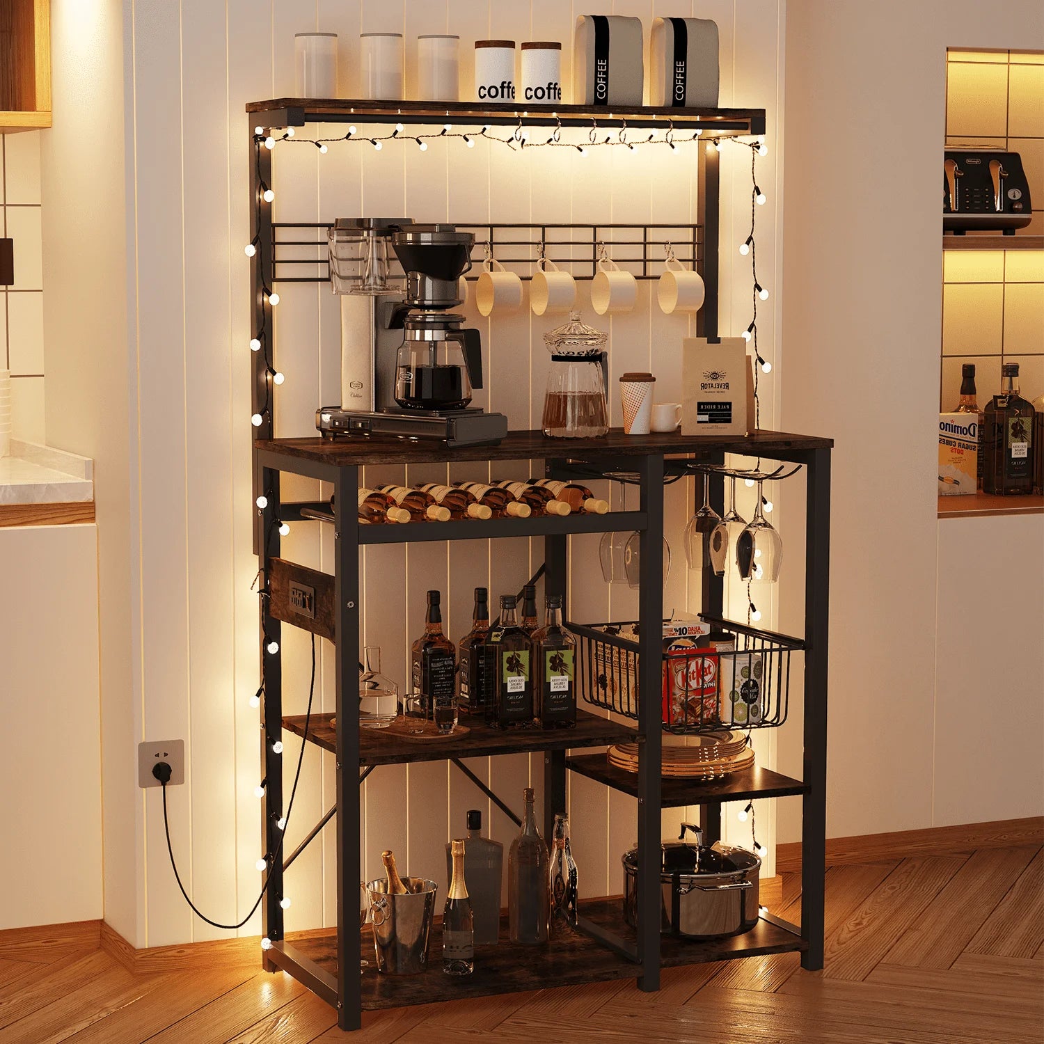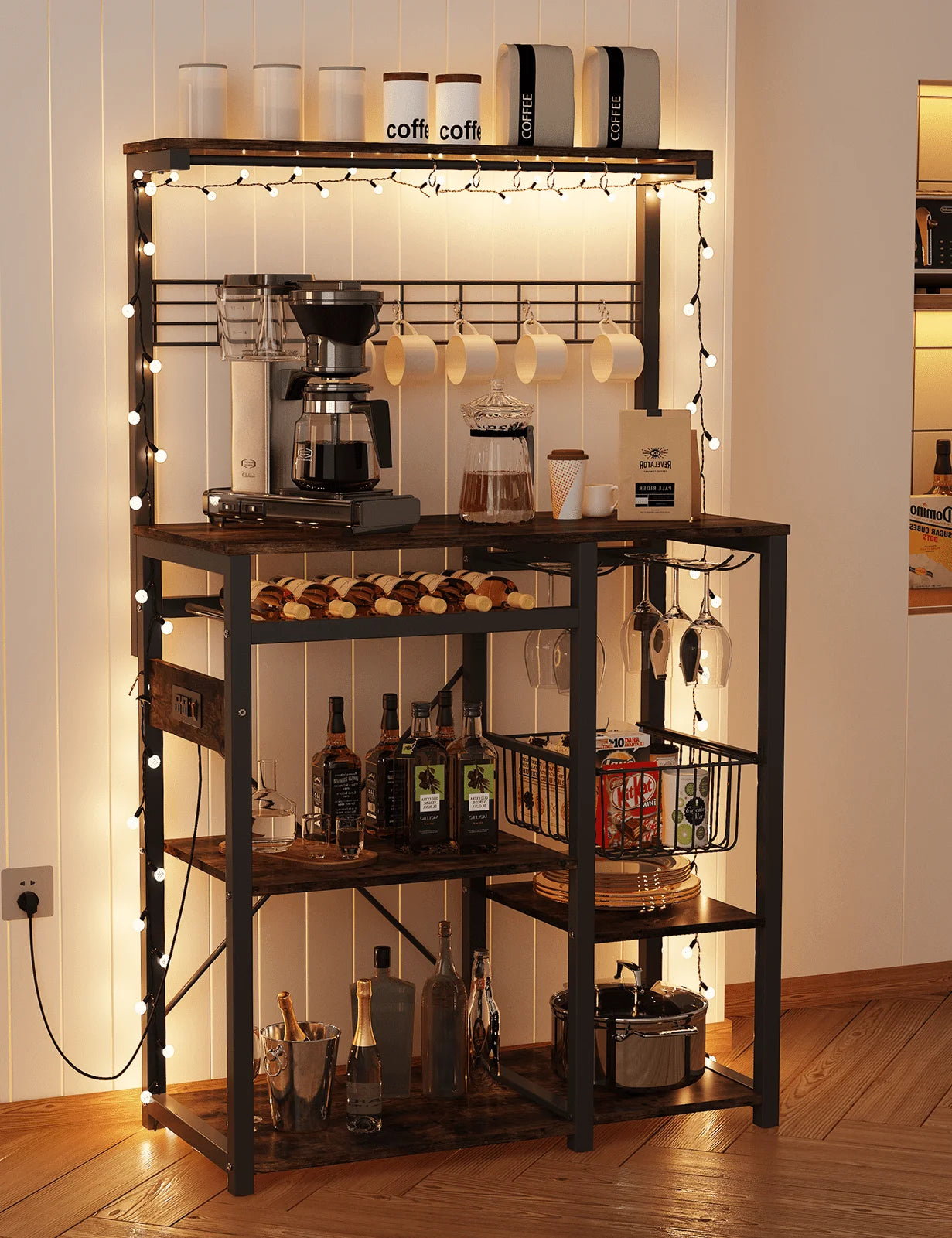 Do you have trouble finding power outlets when you use kitchen equipment? Kitchen Island Coffee Bar comes with 3 AC outlets and 2 USB ports, and 6.5ft long power supply cord. can Plug in multiple appliances such as microwave oven, coffee maker and bread maker at the same time. Velcro tape included to organize your device's cords.
