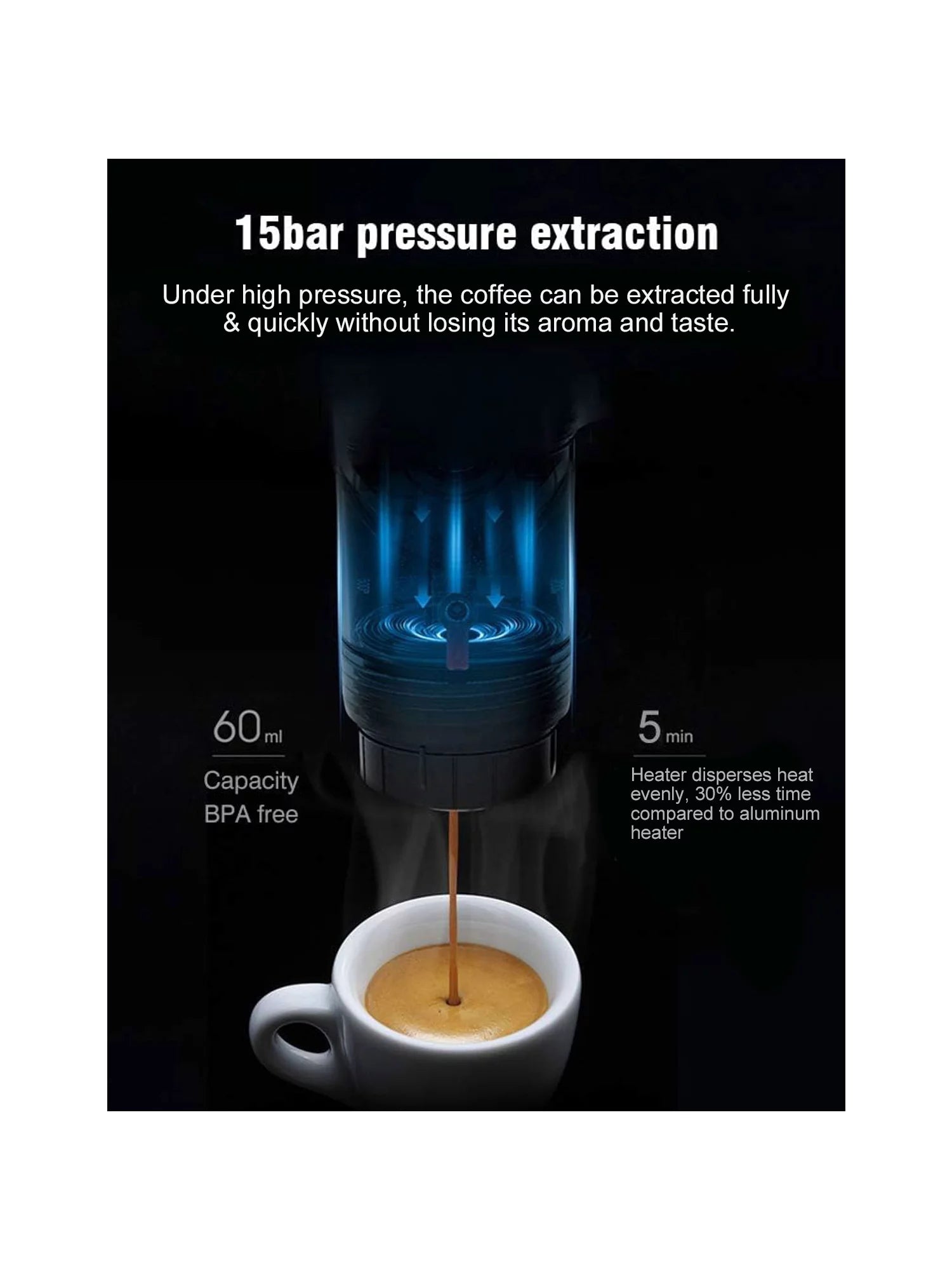 - High Pressure Pump: 12V coffee maker with a powerful high pressure pump, delivering 15 Bar strength for extracting premium coffee from capsules or powder Enjoy consistently flavorful espresso with rich crema, making every cup a delightful experience