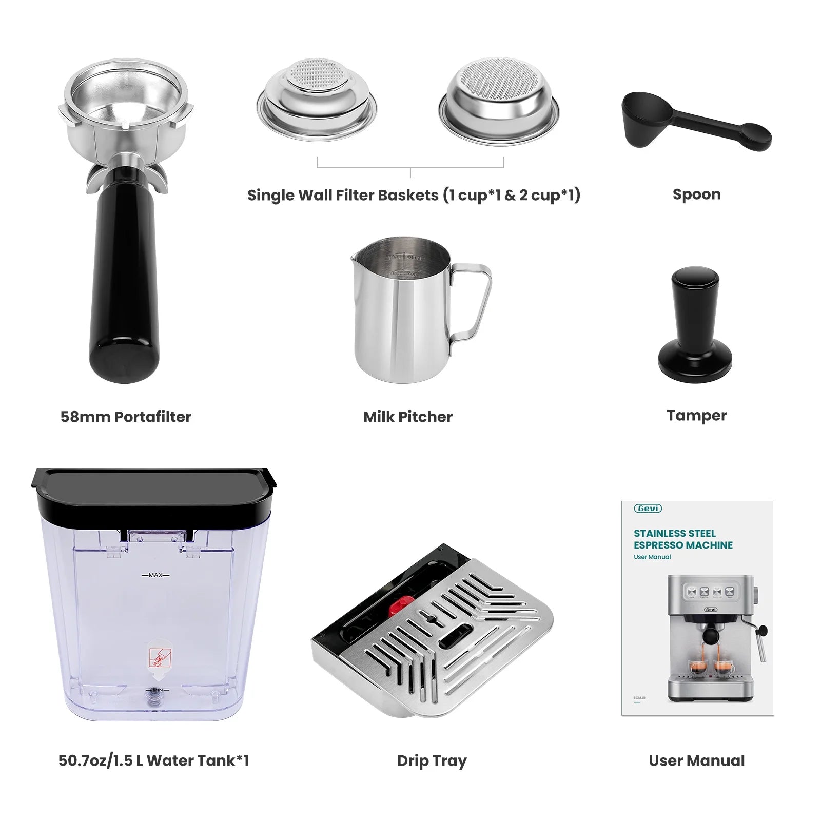 - ๐๐จ๐๐๐๐ ๐๐ข๐ฉ๐ฌ - The Gevi ECM-8503UL espresso machine is equipped with a 20-bar high-pressure system and 58mm Single Wall Filters, enhancing coffee extraction and flow. For the best results, use finer coffee grounds and a tamper to compress the coffee cake tightly. This will yield a fuller crema and a richer, more aromatic coffee experience.