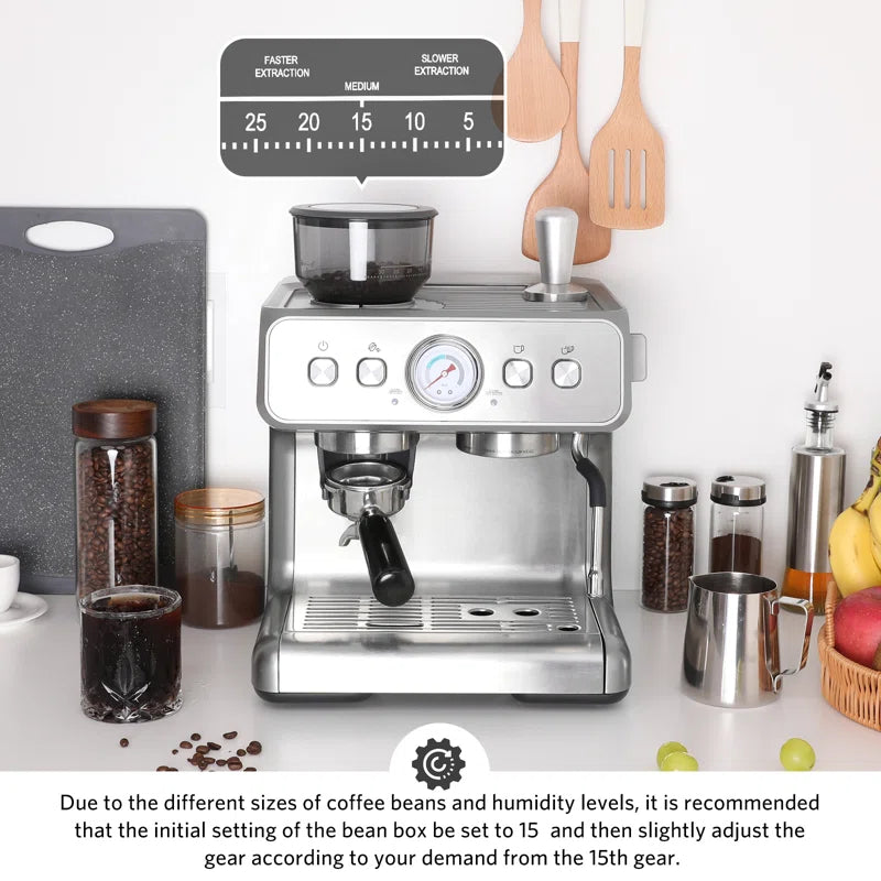 This Elite Espresso Machine is a semi-automatic marvel designed for coffee enthusiasts who appreciate the art of brewing. With its built-in grinder, you can enjoy freshly ground coffee beans, allowing for a customizable coffee experience. The machine features 30 adjustable grinding thickness settings, enabling you to choose the perfect texture for your brewing needs.