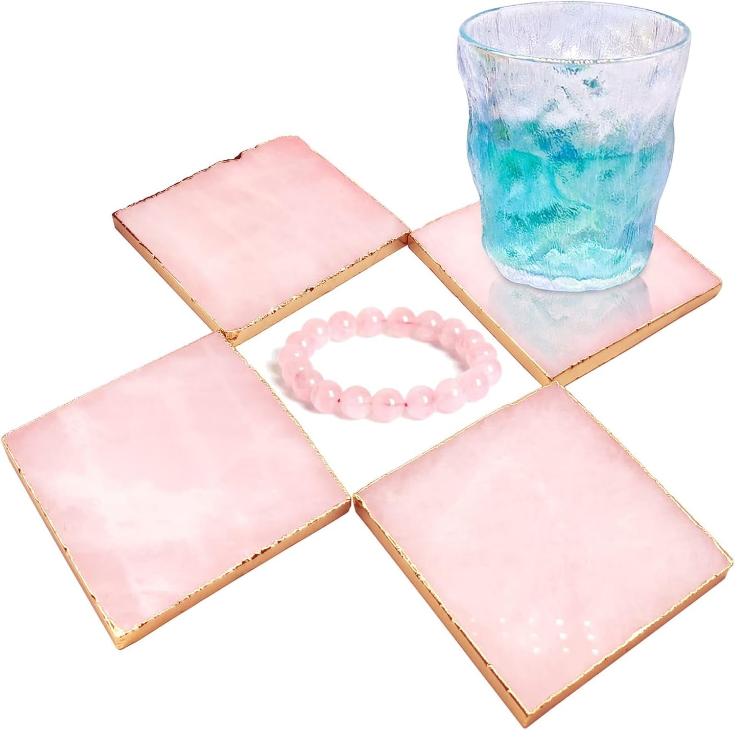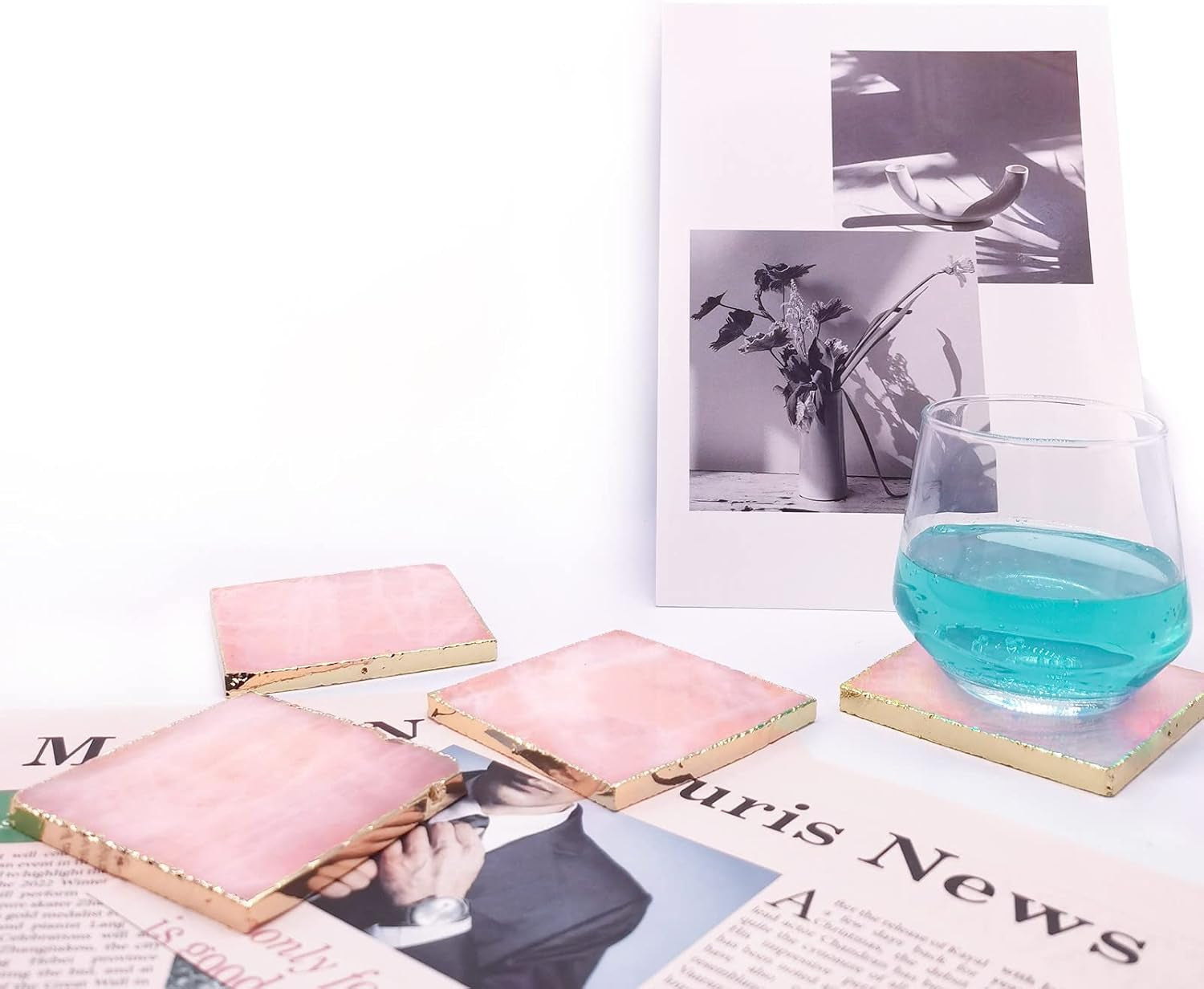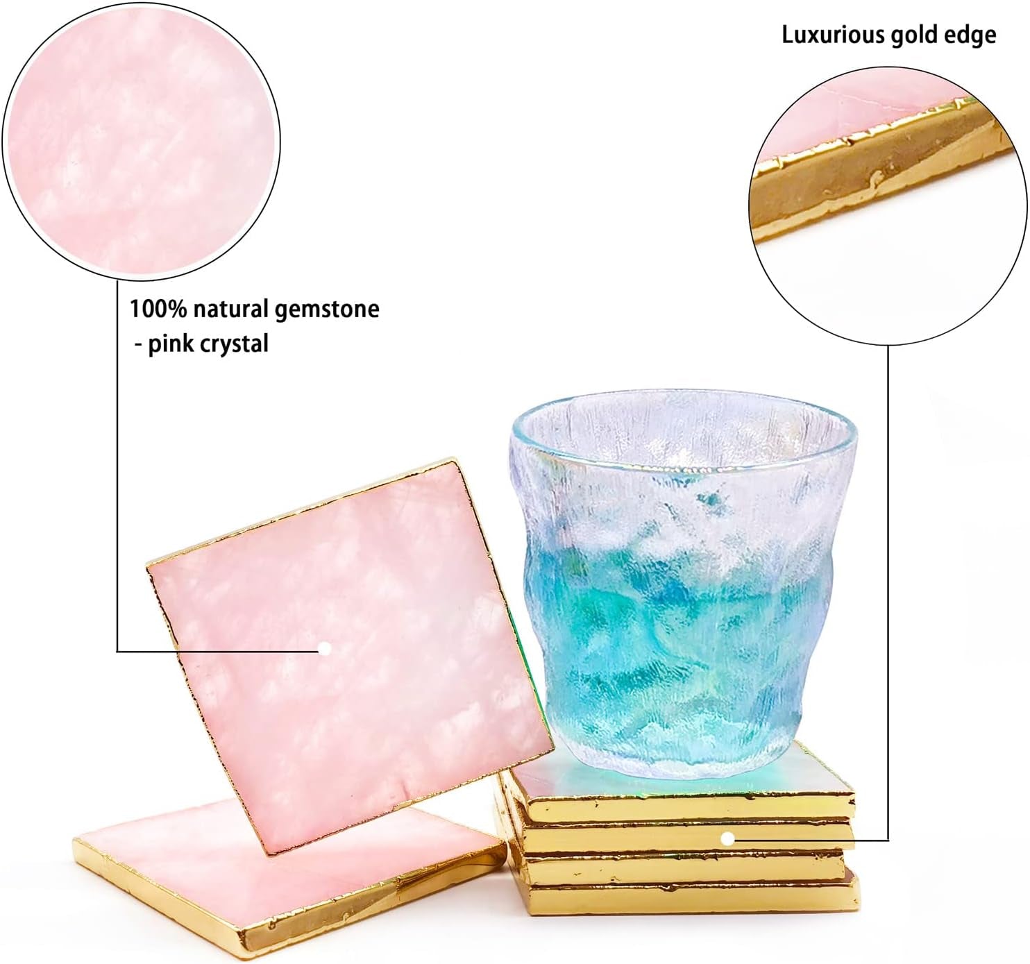Pamper your self and your coffee with this set of four luxury rose quartz coasters! Made from 100% natural pink crystal and edged with dazzling gold, these glamorous mats add a touch of sparkle and style to any dinner table, cocktail hour, whiskey night, or coffee break. Your beverages deserve a little bling and a whole lot of elegance!